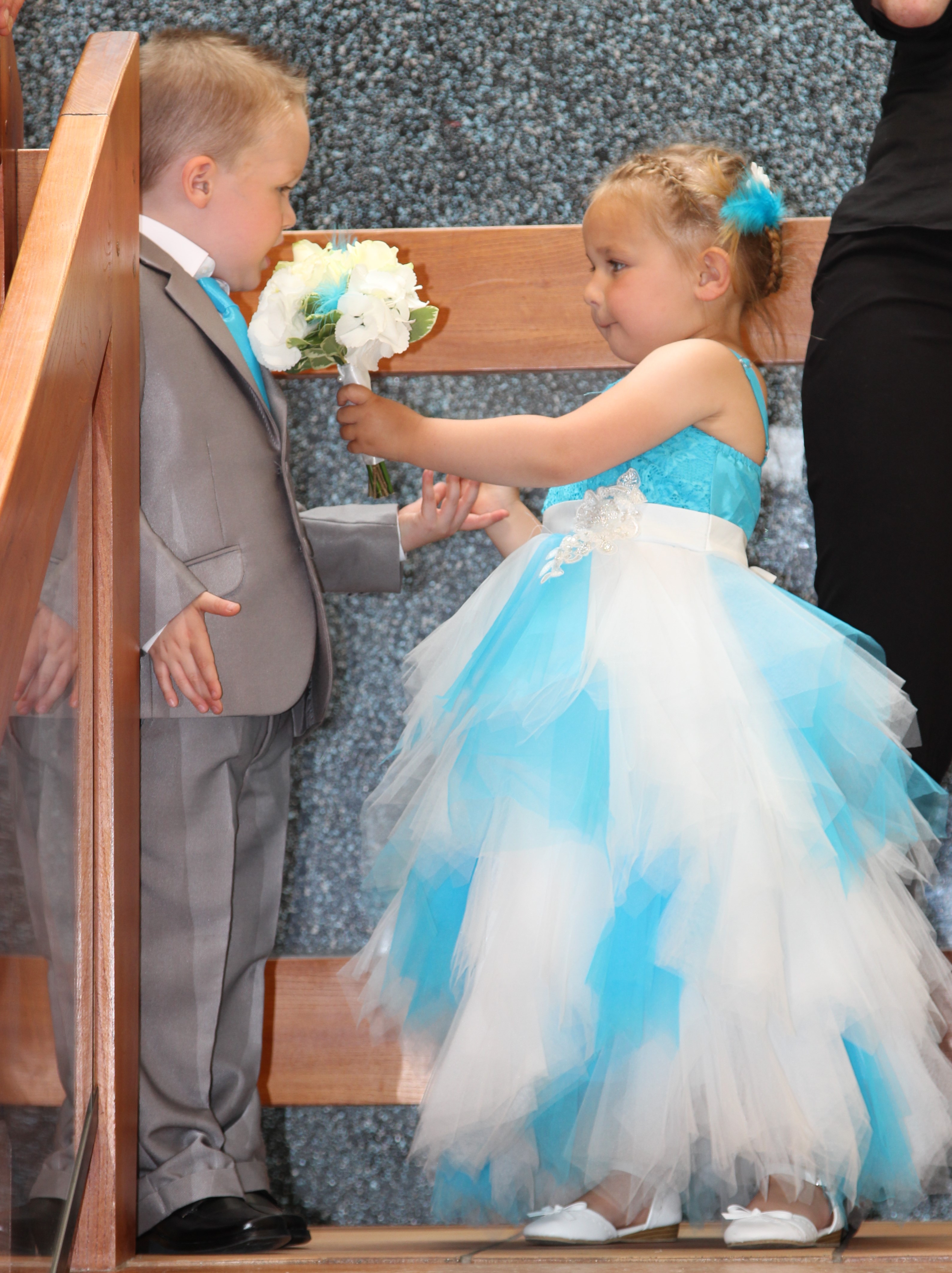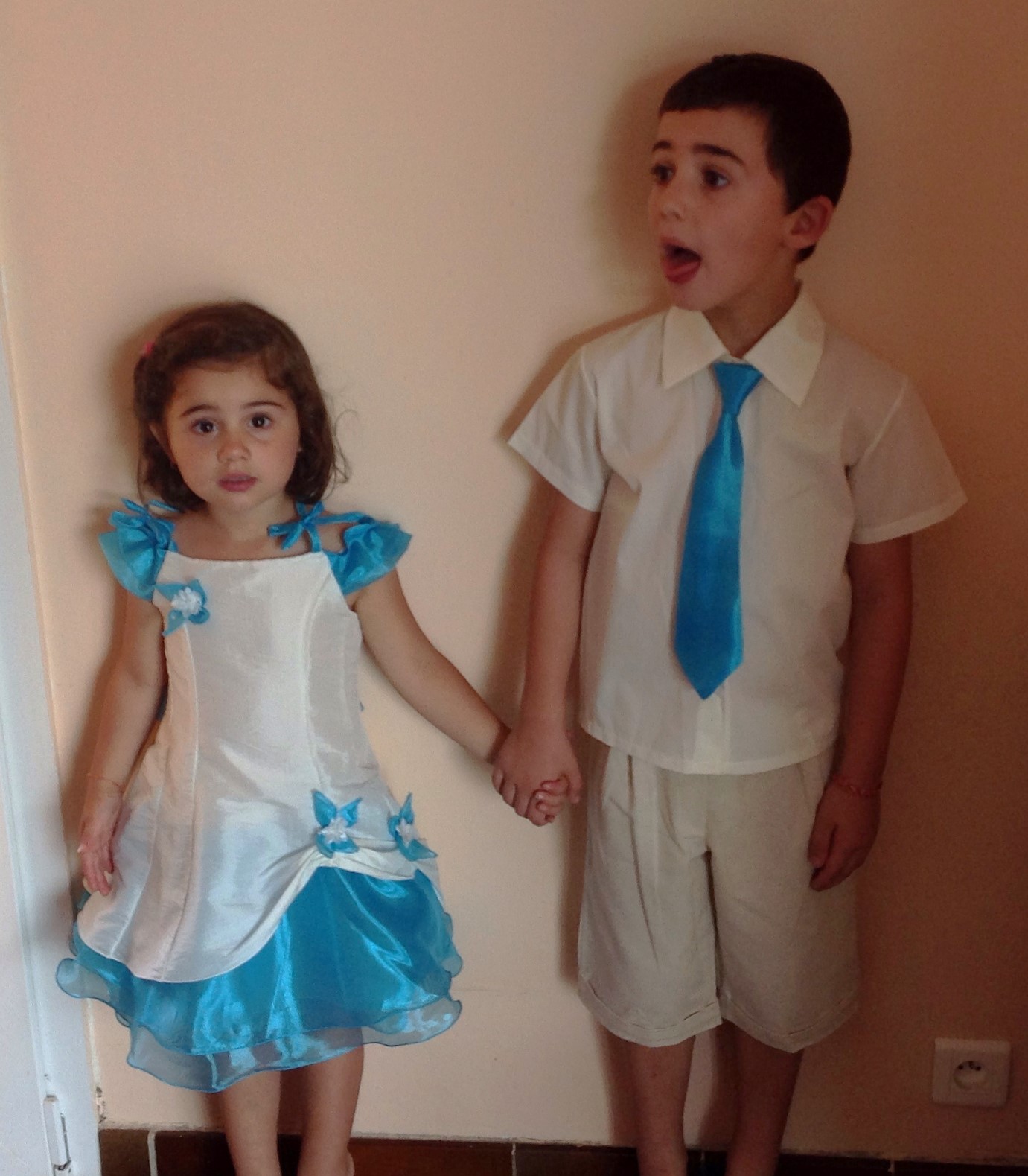 Robe Grace en turquoise et crème , ensemble costume Oliver en crème et cravate turquoise. Excellente qualité, délai impeccable, et surtout magnifiques. Mieux que sur la photo. J'adore.