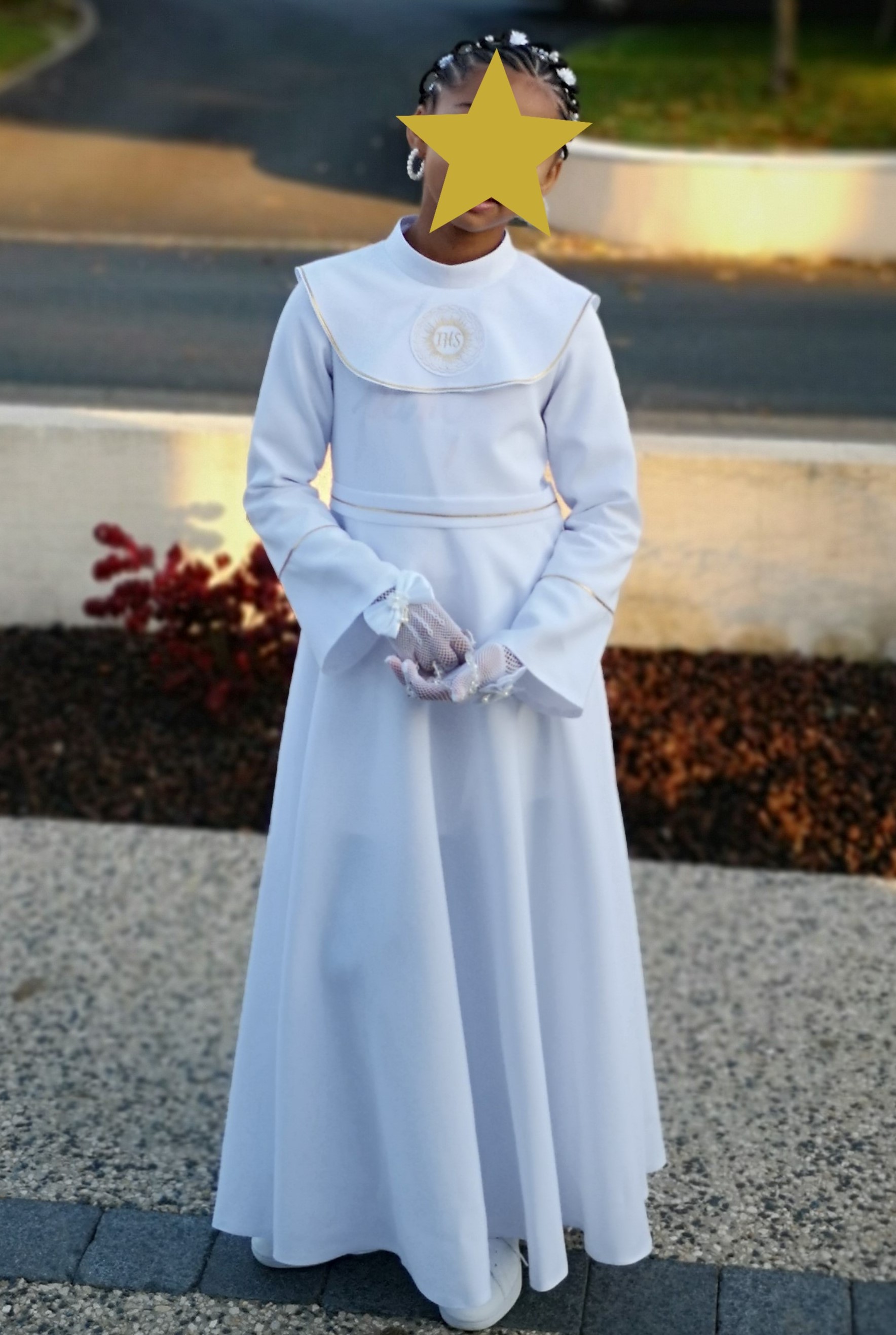 Un grand merci à toute l’équipe pour sa gentillesse et sa célérité! En raison de la Covid, la cérémonie de 1ere communion de ma fille a été reportée en octobre! Nous attendions donc le feu vert pour commander une robe et bien que j’ai effectué une commande plutôt tardive (10 jours) avec une broderie, la robe (modèle robe Aube communion dentelle fille Ambre et cape communion fille) a été livrée dans les temps. La beauté de la 1ere communiante dans cette belle robe toute blanche a ajouté de la solennité à la cérémonie.... les enfants invités à cette occasion ont été sous le charme et ont même demandé à tenir le bas de sa robe après la messe! Trop mignon! Un grand merci!