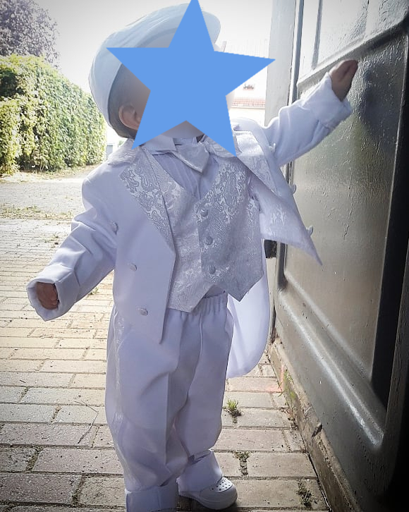 Magnifique costume pour le Baptême de notre petit Iliano. Merci de masquer le visage de mon enfant.