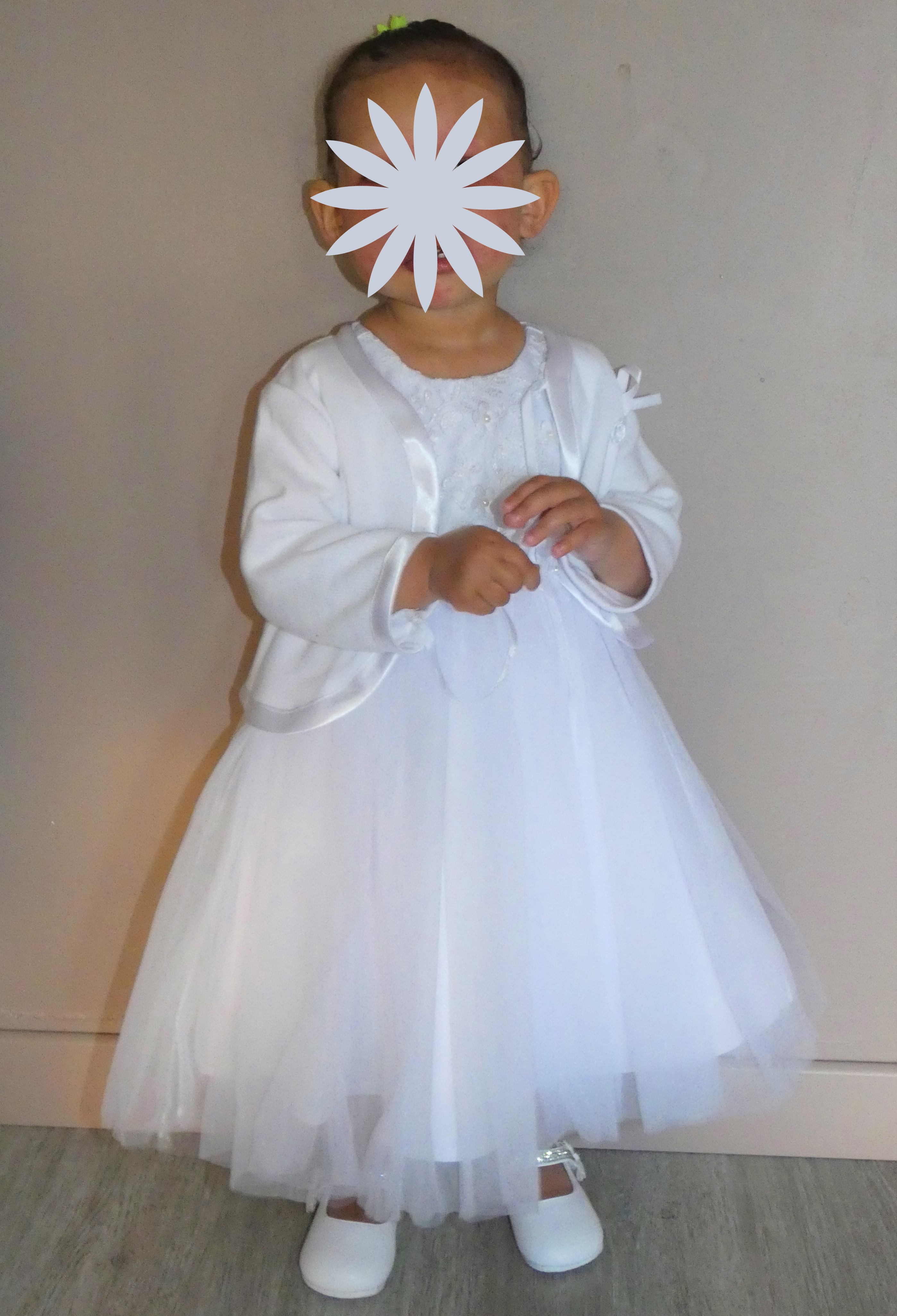 Commande reçue très rapidement (moins d'une semaine). Pas déçu des éléments choisis sur la boutique:robe de bonne qualité avec une superbe broderie. Les soquettes,le gilet et les baskets finissent à merveille la tenue. Ma fille va être sublime pour son baptême et je vous en remercie :)