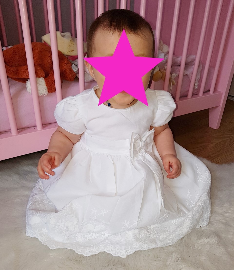 J'ai commandé la belle robe de baptême pour ma fille qui à actuellement 9 mois. J'ai pris du 18 mois en taille car ma fille est plutôt grande, cela lui va très bien et j'adore les FINITIONS. Une robe élégante sobre très mignonne dans un beau tissu ! J'ai également complété la tenue avec une paire de chaussettes avec dentelles, une culotte avec dentelle et nœud blanc magnifique qui cache bien la couche en hauteur et une petite barrette blanche. Je suis très contente de la rapidité et du sérieux du traitement de cette commande. J'attends le réapprovisionnement pour prendre la même robe en taille 4 ans et les mêmes accessoires pour ma fille de 3 ans. Merci et à bientôt