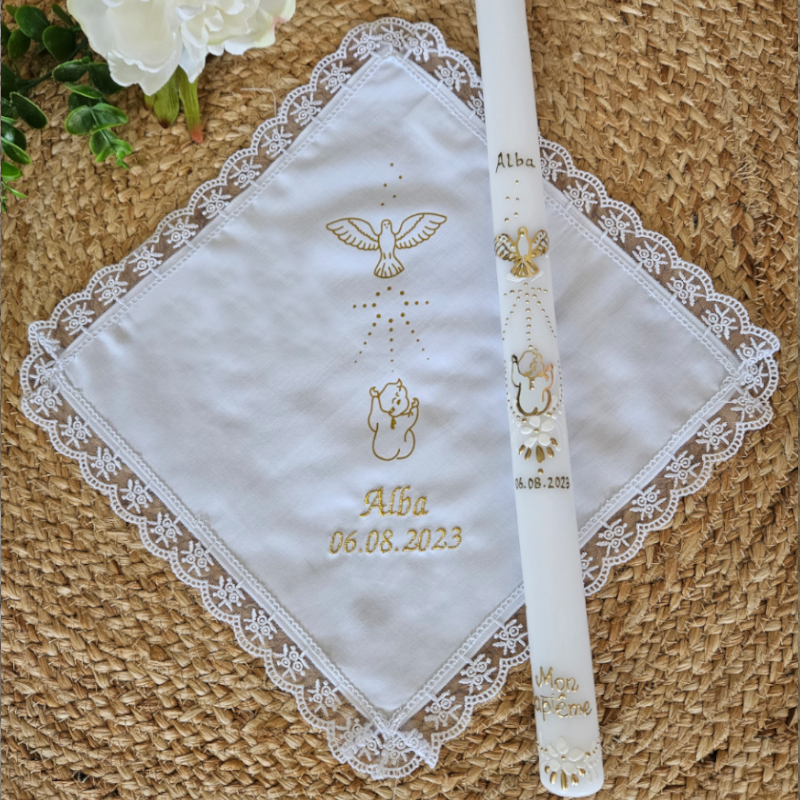 Cierge + mouchoir Baptême collection " bébé et Colombe " - Personnalisable