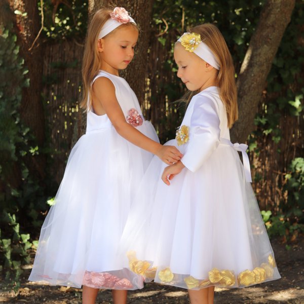 Robe au design féérique. Avec personnalisation des pétales robe et bandeau. Idéal pour un baptême, une communion ou un cortège d'enfant.